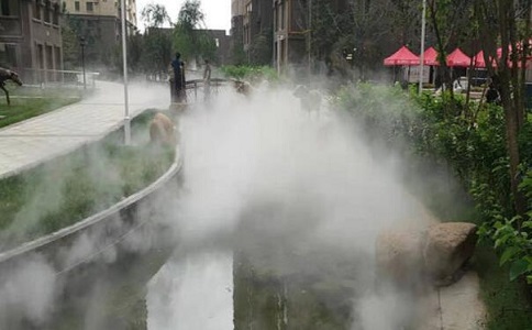 戶外空間環境降溫系統,可以局部地控制大環境的溫度。人造霧降溫系統散發到空氣中的水微粒,在汽化的過程中要吸收大量周圍環境中的熱量,蒸發冷卻從而降低周圍環境溫度的原理